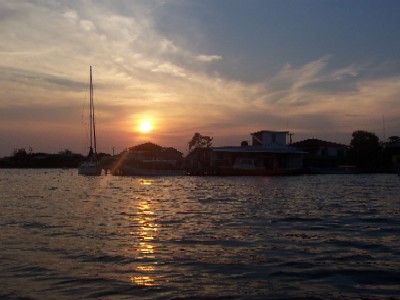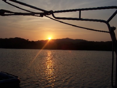 After spending a few more hours there, and having some lunch. We moved on up the lake, stopping at a town for some additional “supplies” (as in beer and mixers!), and continued on up the lake, searching for what I’d heard to be an excellent anchoring spot called “El Refugio”. According to my guides, it was a great little cove that was in a very isolated part of the lake. That description turned out to be true. We were the only boat there. We arrived just before sunset, dropped anchor just in time to get a good swim and watch the spectacular sunset show. We grilled some fresh robalo that I had bought in town the day before, and enjoyed dinner in the cockpit. At night, there was no artificial light whatsoever anywhere around us, except for the flashlight on the occasional passing cayuco carrying a fisherman up the river that ends in the sac of the cove.